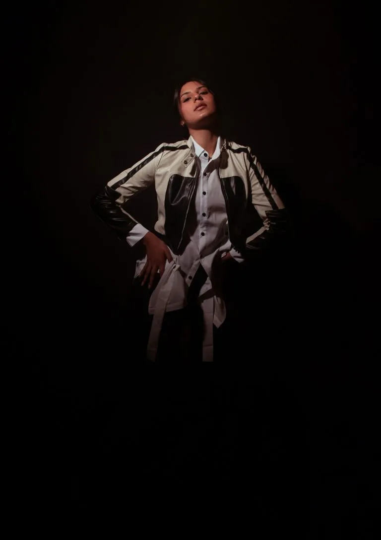 Two photoshoots were scheduled to take place in the same day. We agreed on an urban garment for the studio session so that it would be easier for her to move and pose more confortably. And we picked a long English dress style for the location.