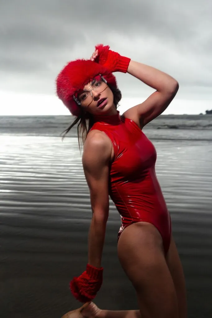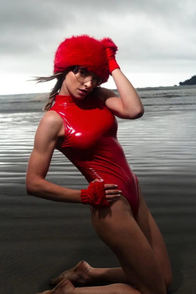 Mrs. Bretas wore a red vinyl fabric swimsuit, a pair of transparent glasses, a red furry Russian style hat and a furry red pair of gloves. Our intention was to send out a warning message on global warming. After wall, and fortunately, this is what fashion can be also for.