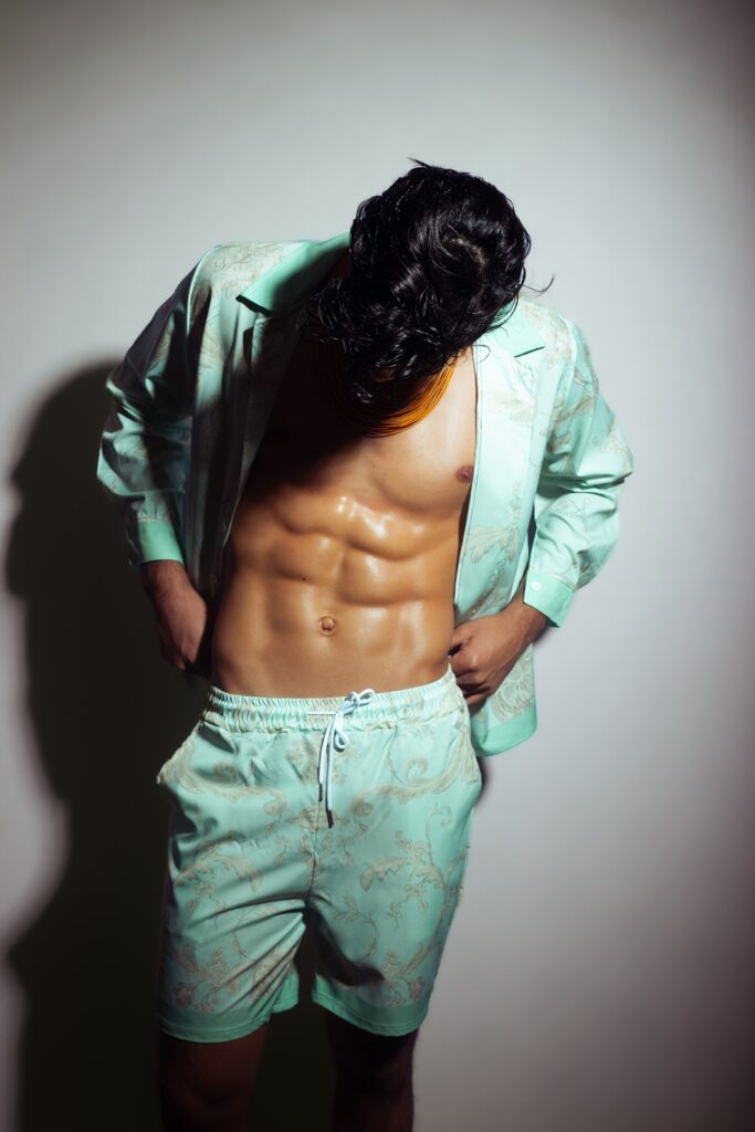 We arranged to have 1 session in the studio and another in a location. In the studio, our idea was to portray a sense of funky casualty with the first garment (a green silk shirt, shorts, yellow necklace and a pair of earrings). On the other hand, with the second outfit, in the location, our intention was to portray an editorial so the images were captured in an old and abandoned train tunnel and the model wore a plain black shirt and a pair of brown Japanese style pants. Both photoshoots did not take long since Mr. Jhyowan is such an experienced model and little direction was necessary. He was extremely skillful, changing poses so quickly, showing to be in control in front of the cameras and being very focused.